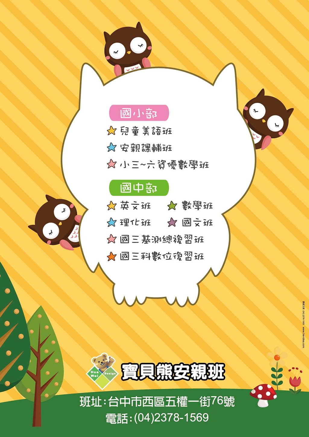 公版內的文字內容皆可修改,位置也可調動,可放上補習班名稱、LOGO、電話、地址、招生班別........等資訊