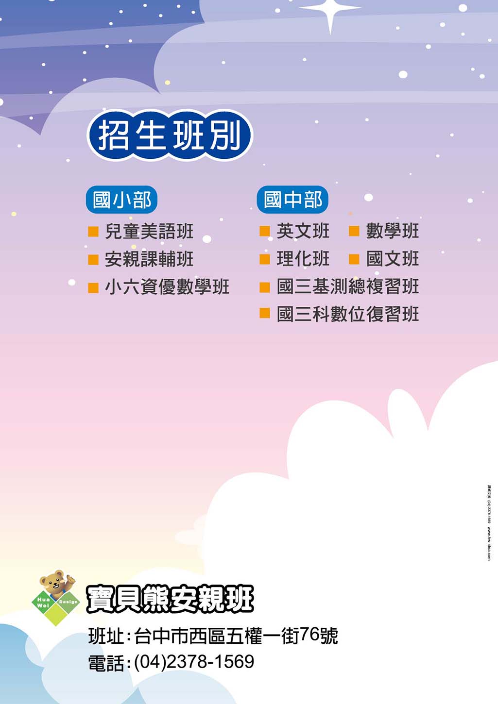 公版內的文字內容皆可修改,位置也可調動,可放上補習班名稱、LOGO、電話、地址、招生班別........等資訊
