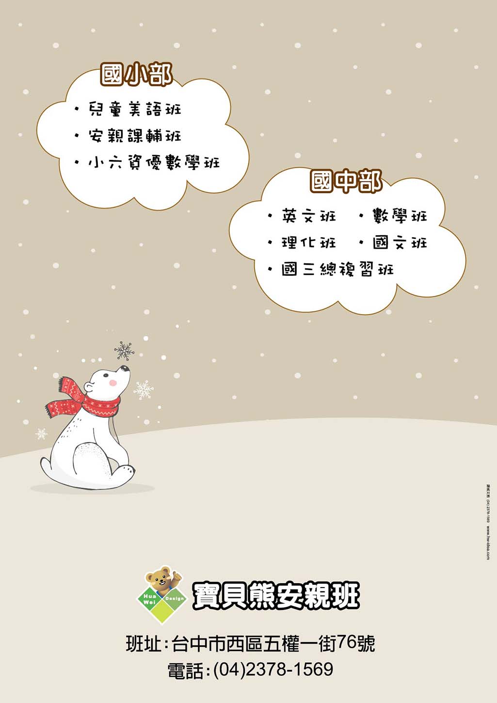 公版內的文字內容皆可修改,位置也可調動,可放上補習班名稱、LOGO、電話、地址、招生班別........等資訊