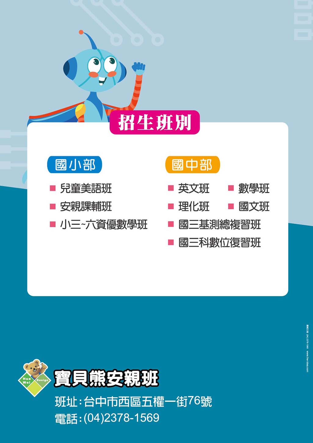 公版內的文字內容皆可修改,位置也可調動,可放上補習班名稱、LOGO、電話、地址、招生班別........等資訊