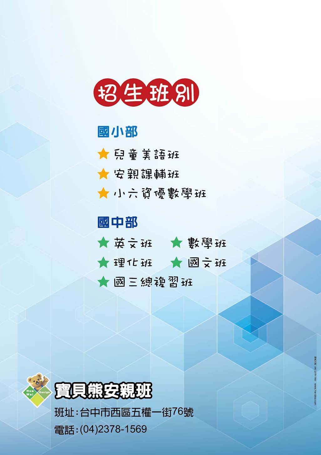 公版內的文字內容皆可修改,位置也可調動,可放上補習班名稱、LOGO、電話、地址、招生班別........等資訊