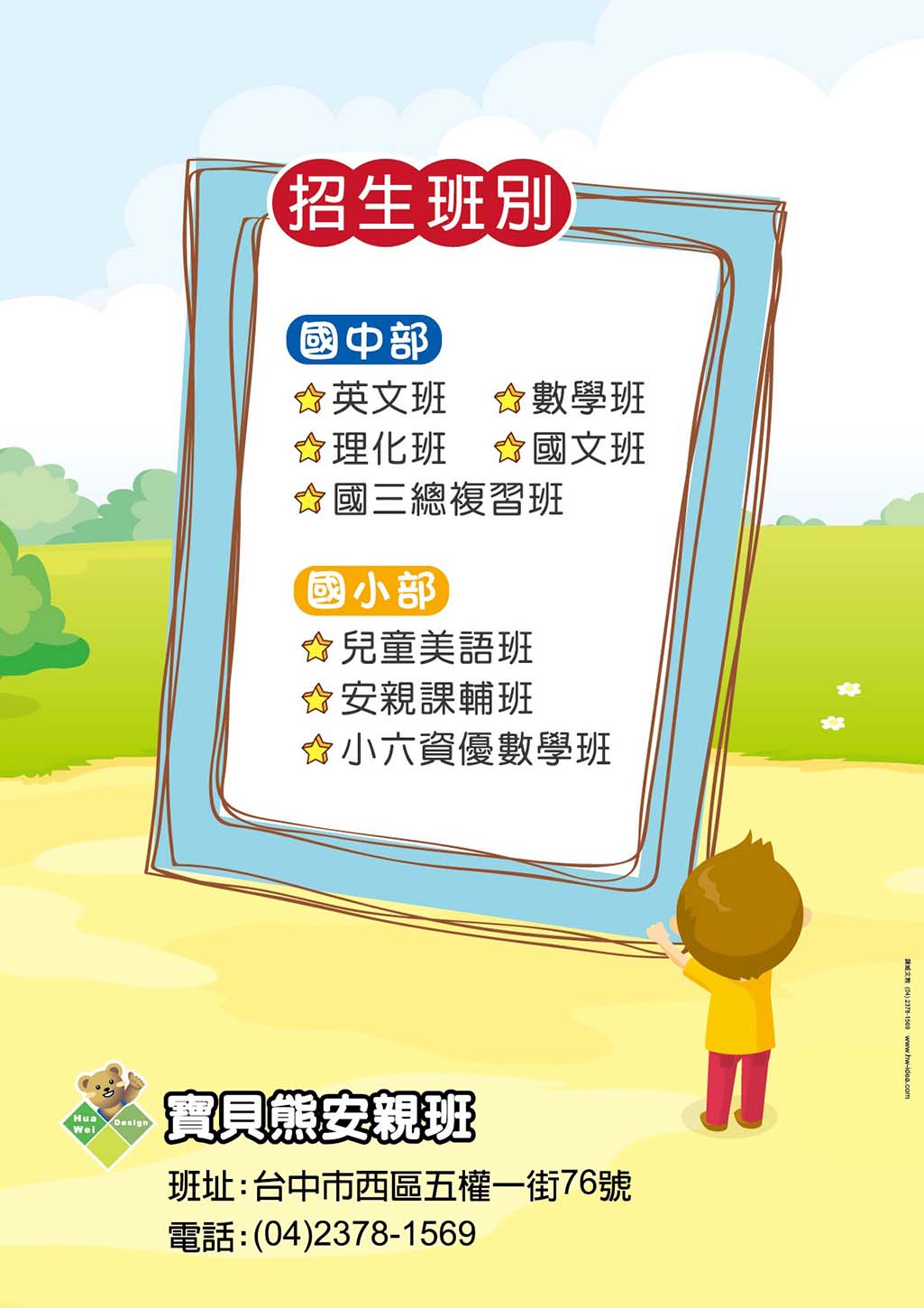 公版內的文字內容皆可修改,位置也可調動,可放上補習班名稱、LOGO、電話、地址、招生班別........等資訊