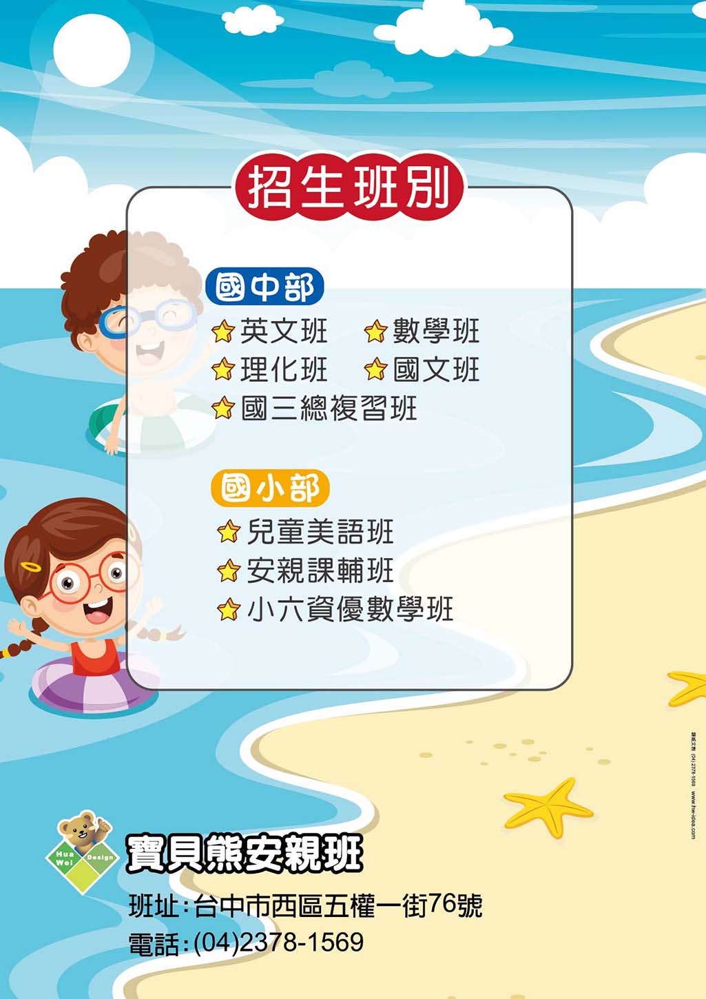 公版內的文字內容皆可修改,位置也可調動,可放上補習班名稱、LOGO、電話、地址、招生班別........等資訊