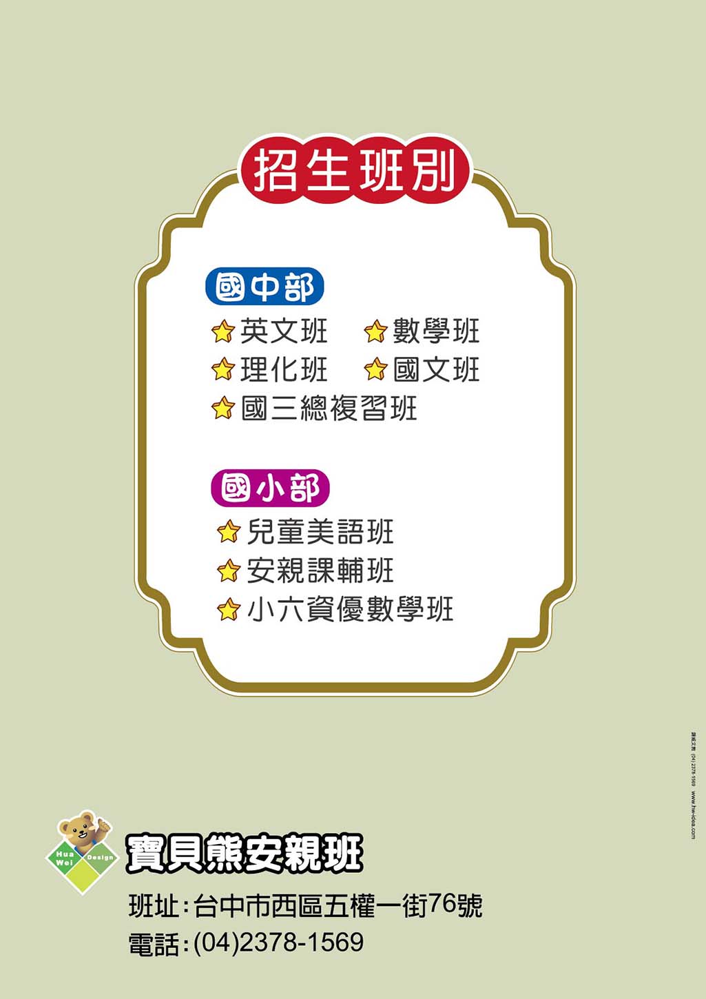 公版內的文字內容皆可修改,位置也可調動,可放上補習班名稱、LOGO、電話、地址、招生班別........等資訊