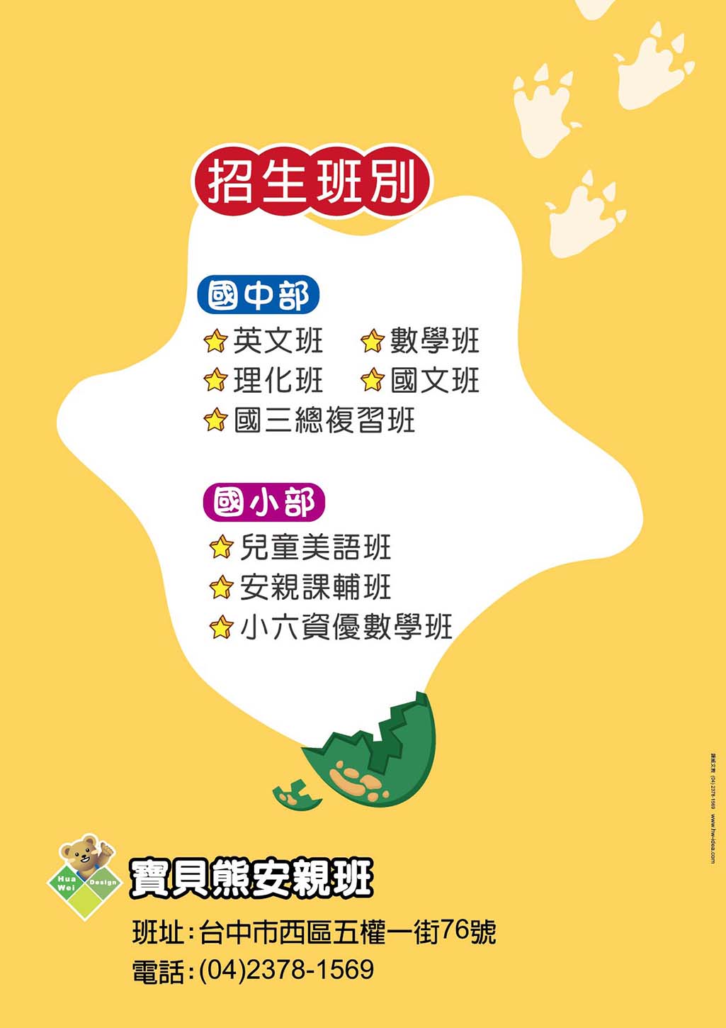 公版內的文字內容皆可修改,位置也可調動,可放上補習班名稱、LOGO、電話、地址、招生班別........等資訊