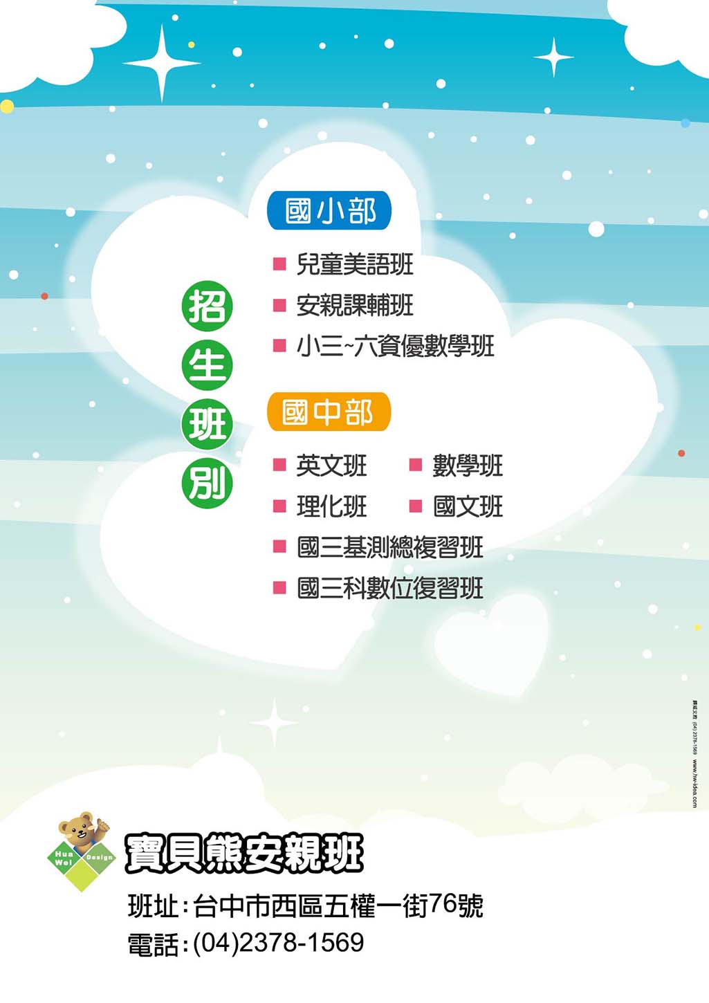 公版內的文字內容皆可修改,位置也可調動,可放上補習班名稱、LOGO、電話、地址、招生班別........等資訊