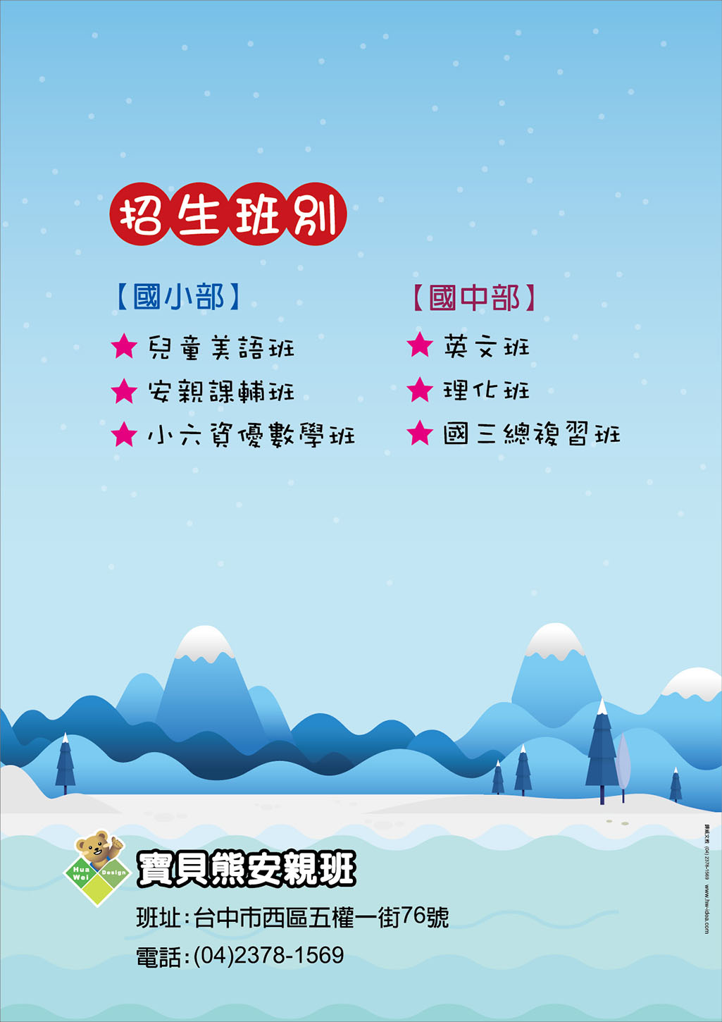 公版內的文字內容皆可修改,位置也可調動,可放上補習班名稱、LOGO、電話、地址、招生班別........等資訊